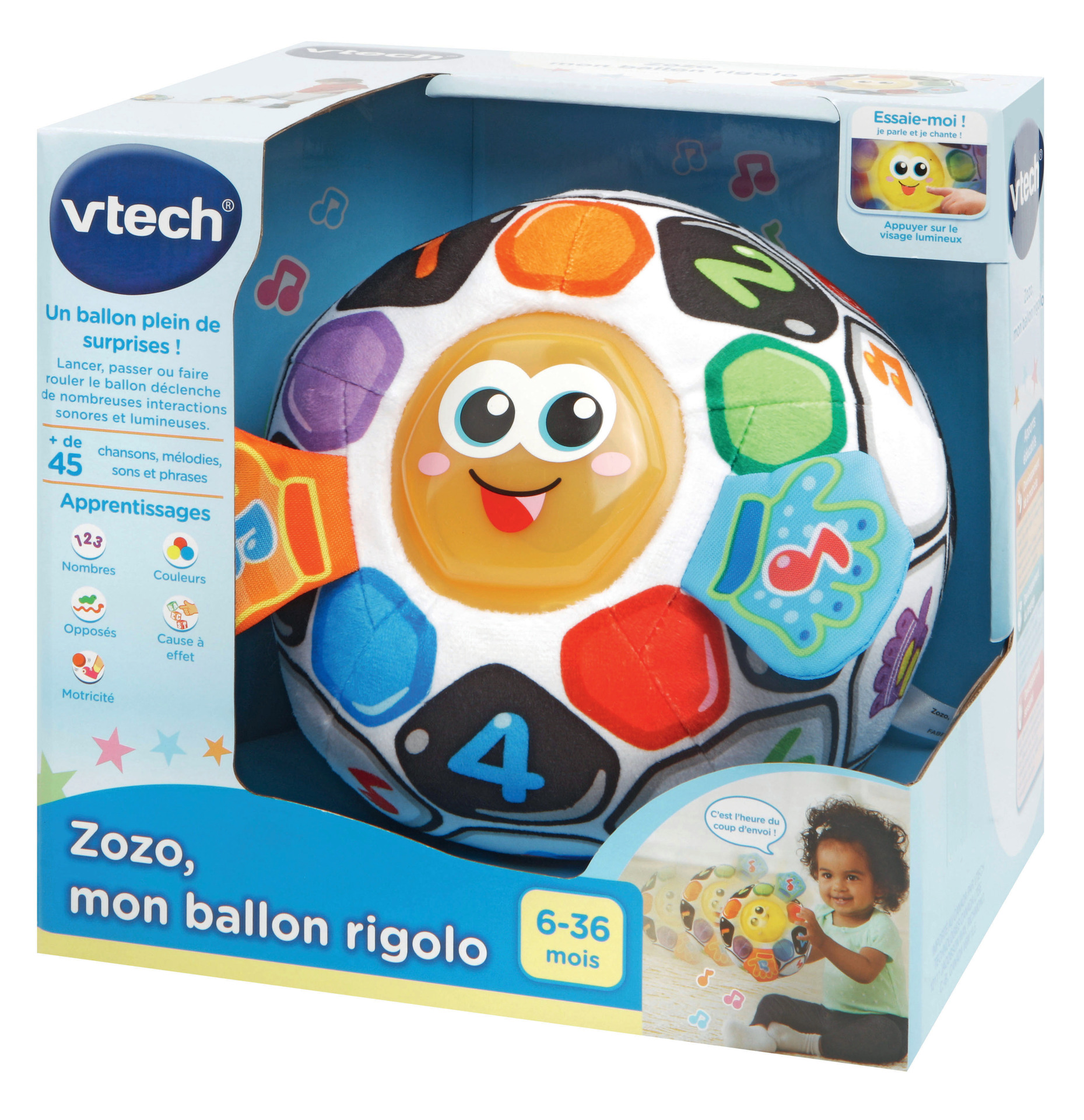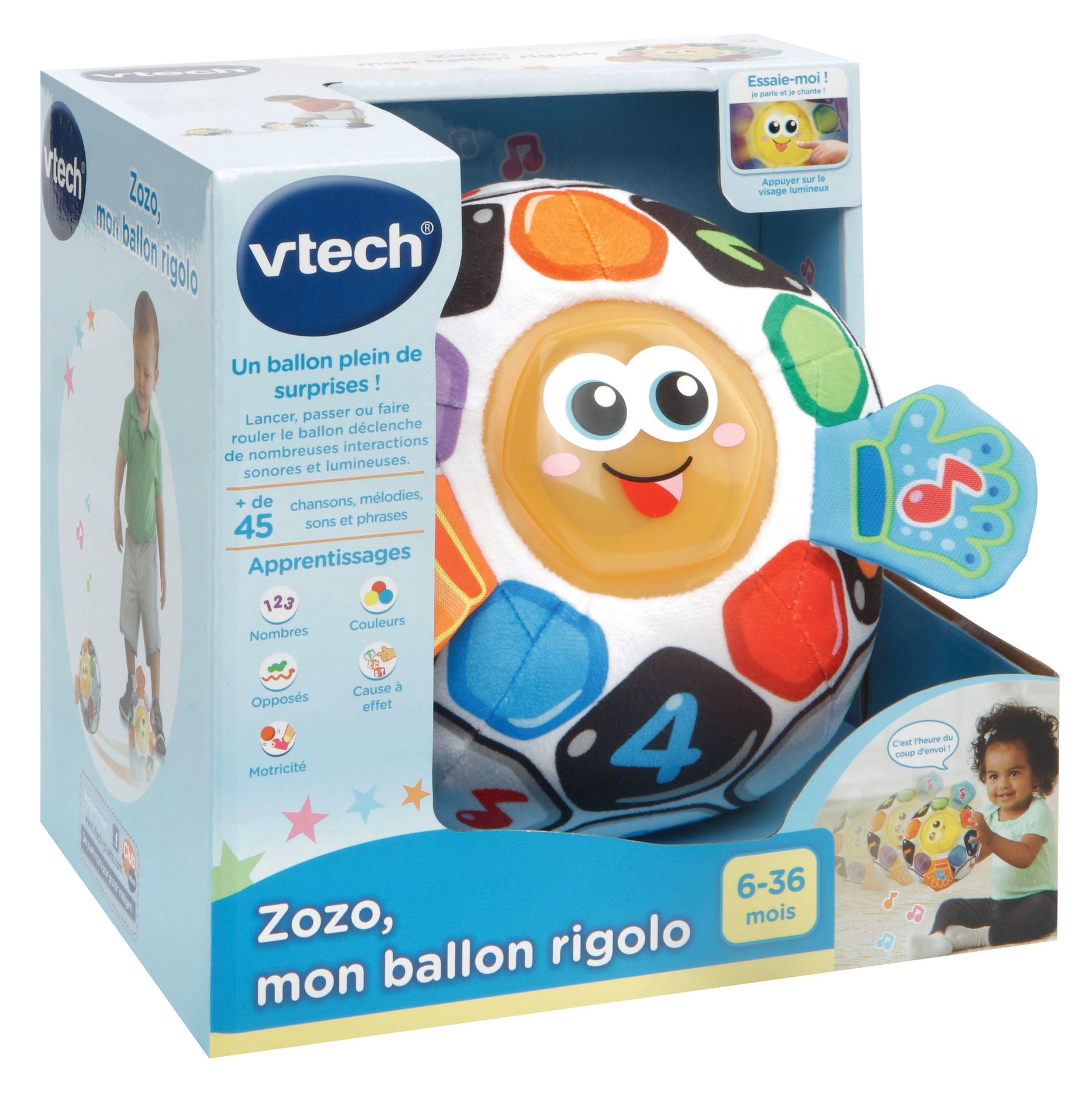 Zozo, mon ballon rigolo - 6 - 36 mois Un ballon de foot joliment illustré pour faire ses premières découvertes ! Bébé appuie sur le visage de Zozo et déclenche des mélodies, des phrases amusantes et des effets lumineux. Grâce au capteur de mouvement, Bébé lance le ballon et déclenche des sons et des phrases amusantes. Bébé découvre les premiers chiffres et les couleurs. Les mains en papier bruissant éveillent la curiosité de Bébé. 15 mélodies et 3 chansons. Module électronique détachable pour laver le ballon (à la main) Réglage du volume sonore et arrêt automatique. Boîte try-me. Fonctionne avec 2 piles LR03 fournies.