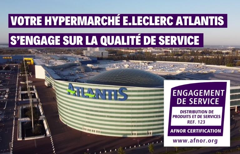 Votre centre E.Leclerc ATLANTIS a obtenu la certification "Engagement de Service" délivrée par AFNOR Certification. Gage de reconnaissance de la qualité de service que nous vous apportons au quotidien avant, pendant et après vos achats. Ce sont vos retours, vos suggestions et votre implication qui nous permettent de nous améliorer chaque année.