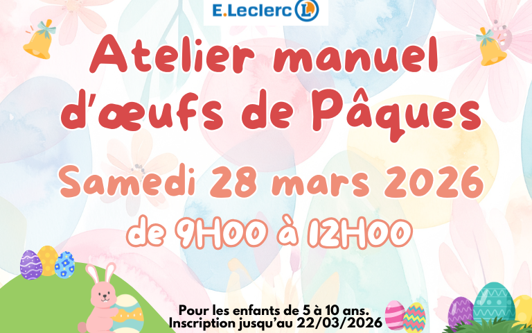 À l’occasion de Pâques, nous invitons les enfants à participer à un atelier créatif pour décorer leurs propres œufs en polystyrène, le samedi 28 mars 2026 de 9H00 à 12H00 dans votre E.Leclerc Crèvecoeur-Le-Grand.