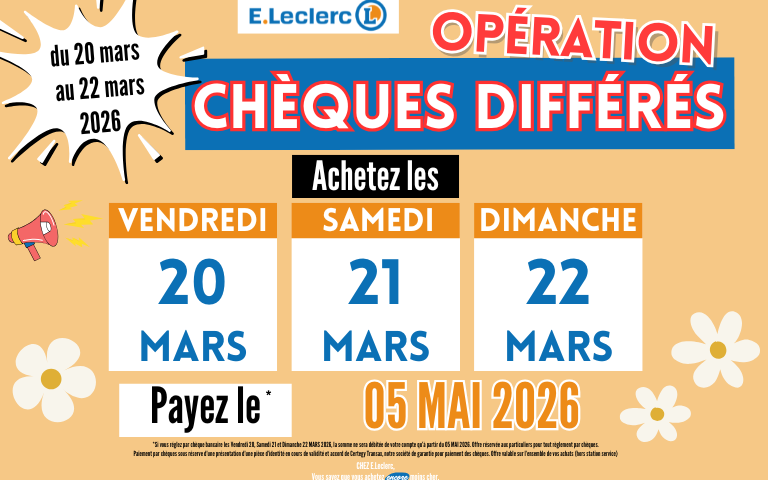 Choisissez d’acheter les 20, 21 et 22 mars 2026 dans votre E.Leclerc Crèvecœur-Le-Grand et ne payez que le 5 mai 2026* ! *𝘷𝘰𝘪𝘳 𝘤𝘰𝘯𝘥𝘪𝘵𝘪𝘰𝘯𝘴 𝘦𝘯 𝘮𝘢𝘨𝘢𝘴𝘪𝘯.