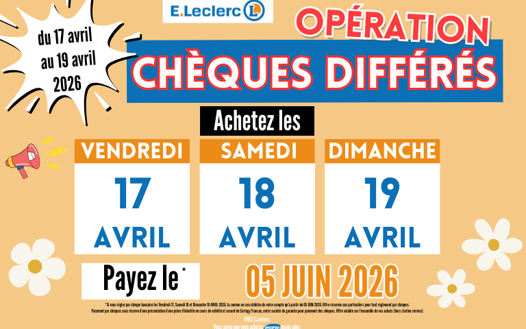 Choisissez d’acheter les 17, 18 et 19 avril 2026 dans votre E. Leclerc Crèvecoeur-Le-Grand et ne payez que le 5 juin 2026* !