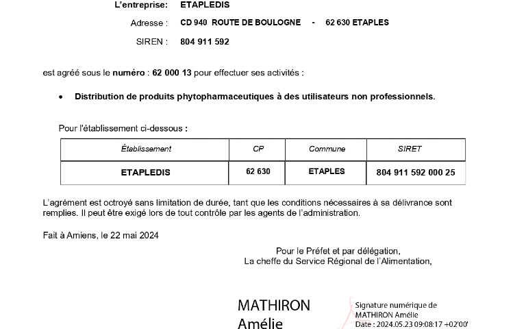 Votre centre E.Leclerc Etaples sur mer est agréé par le ministère de l'agriculture pour la vente de produits phytopharmaceutiques à des utilisateurs non professionnels sous le numéro 62 000 13.