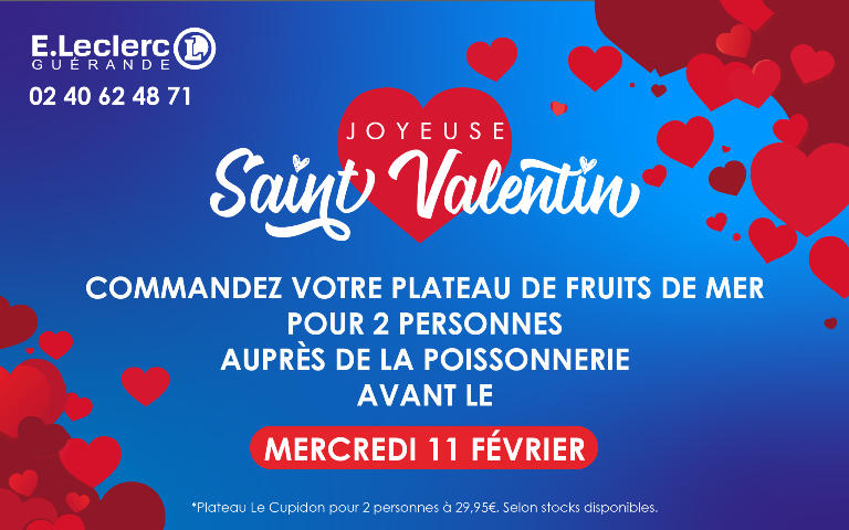 Commandez votre plateau de fruits de mer pour 2 personnes auprès de votre Poissonnerie E.Leclerc Guérande avant le mercredi 11 février. Plateau Le Cupidon pour 2 personnes à 29.95€. Selon stocks disponibles. Joyeuse Saint Valentin !