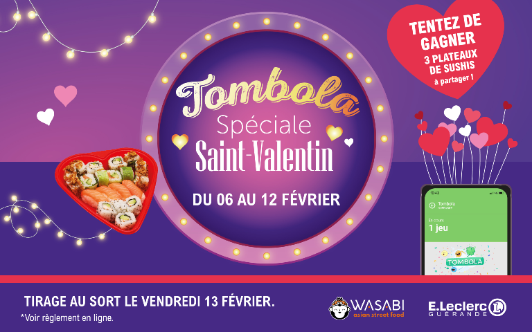 Tombola Spéciale Saint-Valentin du 06 au 12 février dans votre magasin E.Leclerc Guérande. Tirage au sort le 13 février. Voir conditions.