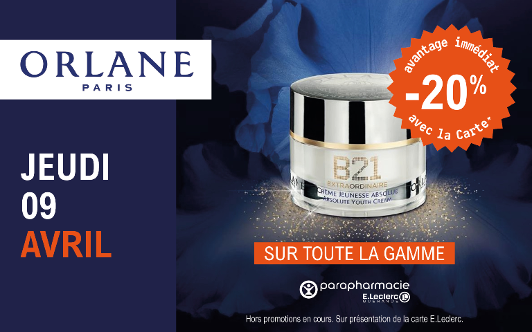 Jeudi 09 avril, rendez-vous dans votre Parapharmacie E.Leclerc Guérande pour une offre exceptionnelle. Bénéficiez de -20% de réduction immédiate sur la gamme ORLANE Paris, la Haute Cosmétique Française, synonyme de qualité et d'excellence.