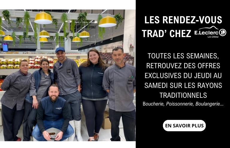 Ce sont des produits frais à prix barrés sur chaque rayon traditionnel (Traiteur, Primeur, Poissonnerie, Boucherie, Boulangerie et Fromagerie). Les promotions sont disponibles chaque semaine, du jeudi au samedi, EXCLUSIVEMENT au E.Leclerc de La Crau.