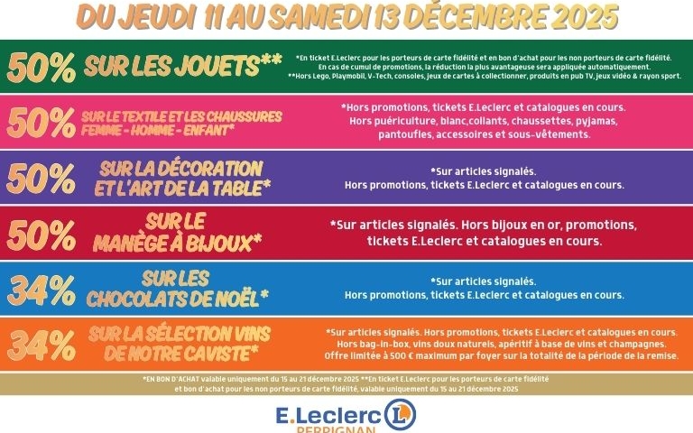(1) En ticket E.Leclerc pour les porteurs de carte fidélité et en bon d’achat pour les non porteurs de carte fidélité.