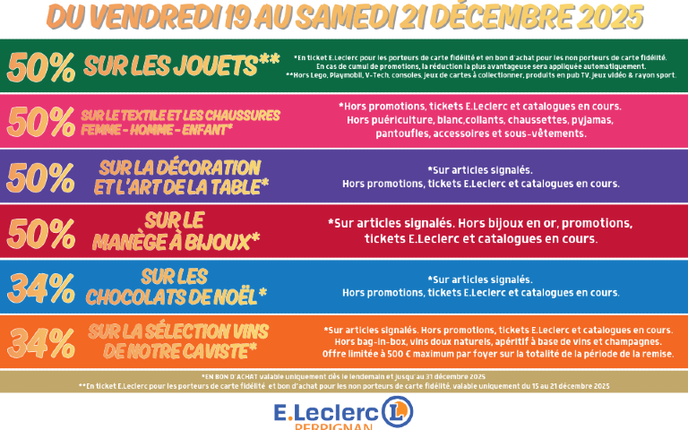 (1) En ticket E.Leclerc pour les porteurs de carte fidélité et en bon d’achat pour les non porteurs de carte fidélité.