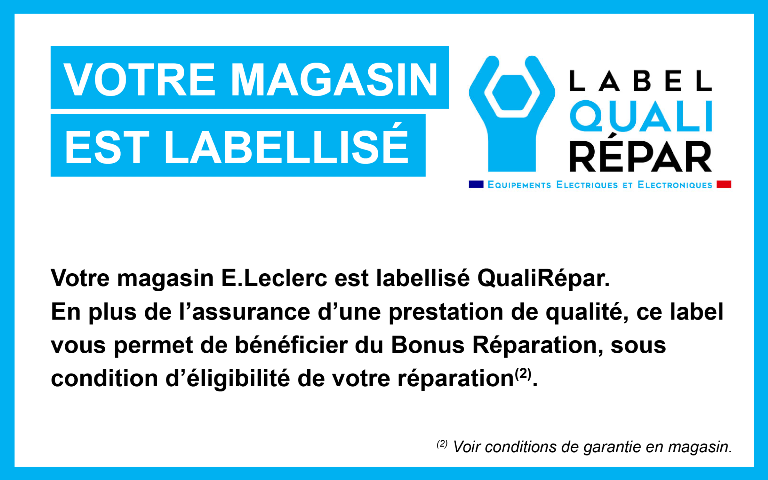 Votre magasin E.Leclerc Le Relecq-Kerhuon est labellisé QualiRépar. En plus de l'assurance d'une prestation de qualité, ce label vous permet de bénéficier du Bonus Réparation, sous condition d'éligibilité de votre réparation*.