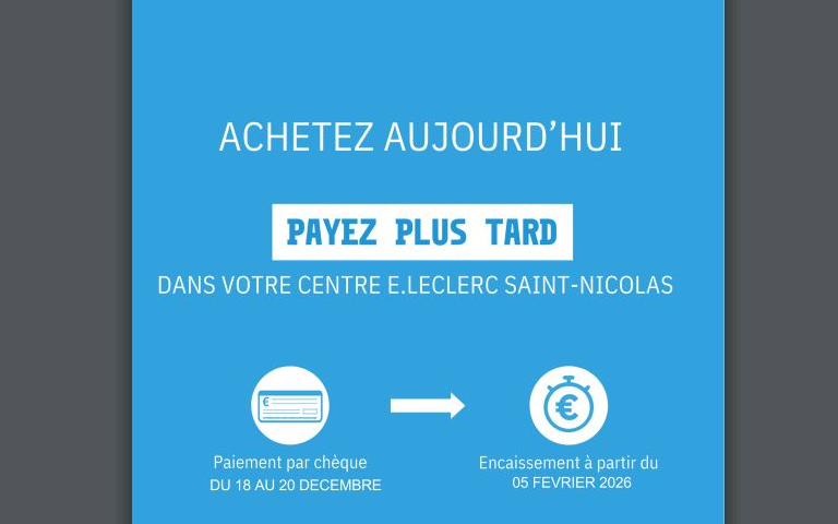 Achetez le jeudi 18, vendredi 19 ou samedi 20 décembre, payez par chèque*, il ne sera débité que le 5 février 2026 sur simple demande en caisse.